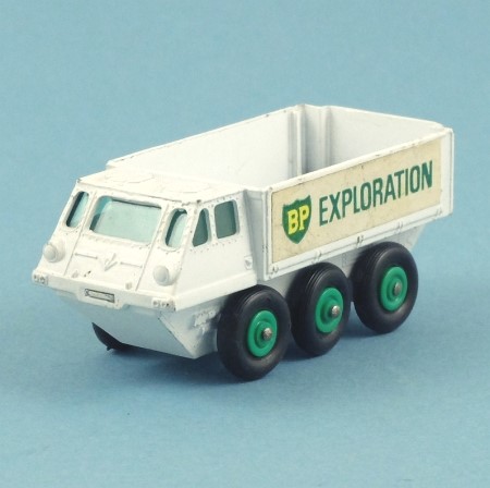 White with green tinted windows. The six wheels are green with black tyres and suspension. 'BP Exploration' labels on the sides.