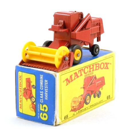 This combine harvester is red with yellow plastic cutting blades that rotate as the model is pushed along. The rear wheels are black plastic while the front ones are yellow plastic with black tyres. This is the casting version with a hole in the base.