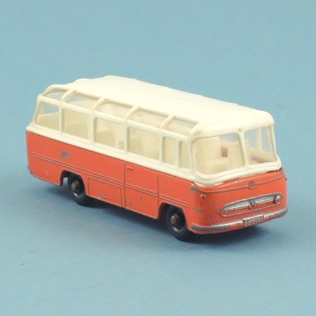 Orange body with white plastic roof and interior. Clear plastic windows and black plastic wheels.