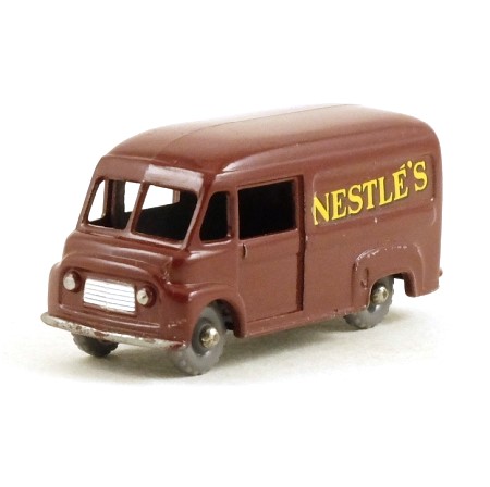 Maroon with silver grille, headlights and bumpers, and black base. Grey plastic wheels 20-tread wheels on rounded axles, This model has a sliding driver's door and 'Nestlés' decals.