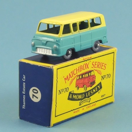 This is a very fine example of the first issue of the Matchbox Thames Estate. In two-tone turquoise and yellow, this is one of the most attractive early Lesney models although I don't remember seeing any real ones on the road in such bright colours!