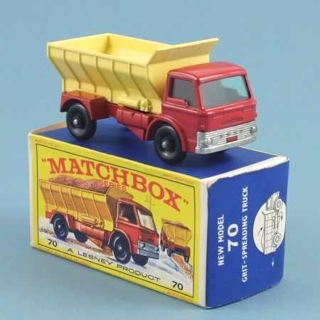 Red cab and chassis, unpainted metal base and grille, green tinted windows. The rear body is pale yellow, with a spreading chute which is operated by a black plastic slide at the rear.