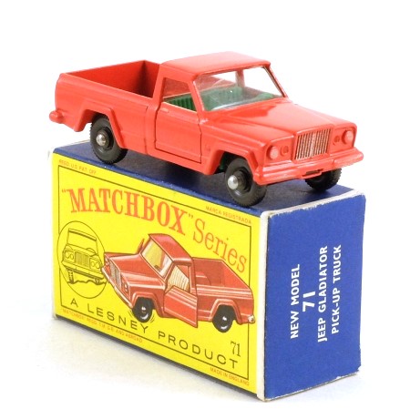 Red, with silver grille and headlamps, black base and clear windows. This is the scarcer early version with green interior. The opening doors have plastic door springs/springs. The wheels are black plastic with suspension on the front.