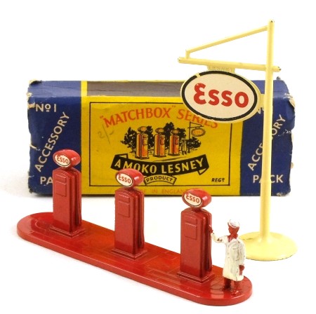 Red petrol pumps, attendant has white coat and hat. 'Esso' decals on both sides of the pumps. With separate sign in cream metal, with 'Esso' decals on each side in red, blue and white.