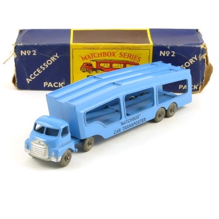 This is an early issue of the Bedford Car Transporter, in blue with silver grille, headlamps and bumper. 'MATCHBOX CAR TRANSPORTER' lettering on the trailer sides. Grey metal wheels on crimped axles.