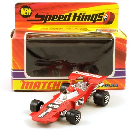 This scarcer early issue has a red body with unpainted metal base, chrome plated windscreen, steering wheel, engine and exhaust, and white driver with red helmet. Flame Out Racing' labels in black, red and white, with chequered stripes and 'WMG Marketing' logos. The wheels have a silver 'Maltese cross' design.