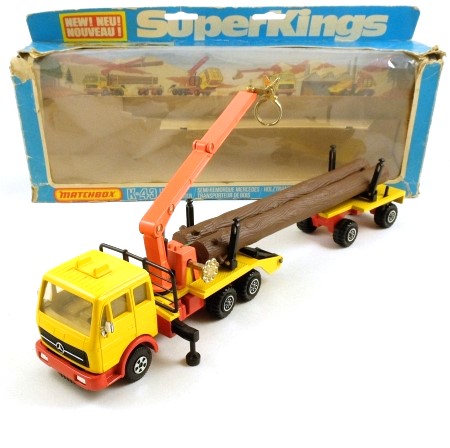 This log transporter consists of a yellow and red Mercedes truck with swivelling and orange extending crane and operating winch. The separate matching bolster trailer is towed by the winch 'cable', which can be wound in or out to accommodate different lengths of log. It can also be hauled up onto the truck via drop-down ramps, for transportation without a load. A brake lever on the trailer prevents it rolling off the truck.