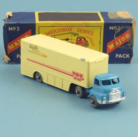 Light blue Bedford tractor unit with cream coloured articulated trailer, which can be decoupled. The trailer has 'Walls Ice Cream' decals. Both tractor and trailer have grey metal wheels on crimped axles.
