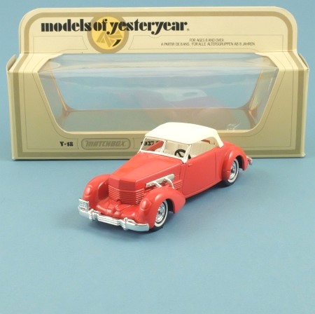 With its front wheel drive, independent front suspension and distinctive styling with concealed headlamps, the Cord 810 caused a sensation at the 1935 New York Auto Show. The 812 was a supercharged version of the 810, distinguished by its chrome-plated exhaust pipes on the bonnet (hood) sides, and these are faithfully reproduced on this Yesteryear model.