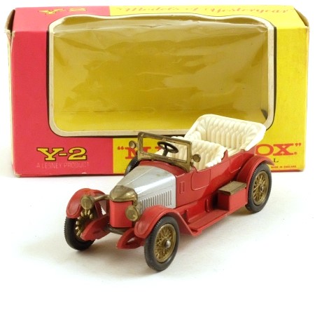 Dark red with silver bonnet. Brass effect fuel tank, side step, radiator surround, front lights and windscreen frame. Off-white seats and black steering wheel. Red grille. The 24-spoke cast wheels have black tyres, including the spare.