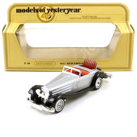 Silver, black base and wings, chrome chassis, bumpers, radiator, headlights, windscreen frame, exhausts and dashboard. Red seats. Folding 'dickey' seat. Chrome 24-spoke wheels with whitewall tyres, including spare.