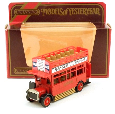 Red metal lower deck and plastic upper deck, black chassis, brown seats and side guards. Black radiator with chrome surround. 'General' in gold on lower body sides. There are 'Schweppes Tonic Water' labels on the sides of the upper deck in black and white, and a label on rear advertising Horlicks, Oxo and Cerebos. The destination board label on the front shows Hither Green Station, with 'Hudson's Soap' ads on either side. Wheels are red plastic spoked with black tyres.