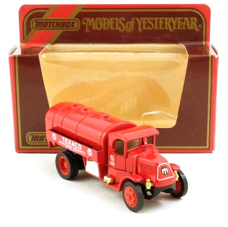 Red, black base, beige seat and black dashboard and steering wheel. Chrome petrol cans and other parts, gold headlights. 'Texaco' tampo print on the sides and rear in white, early Mack emblem on the front in white, red and black. Red plastic wheels with black tyres, double at the rear.