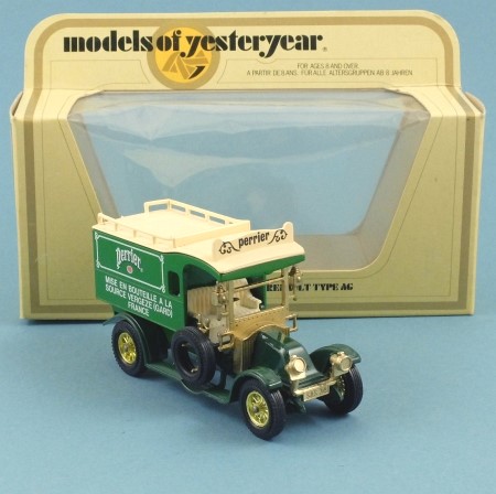 Green, with dark green chassis, white roof and seats. Gold windscreen frame and lights. Bright greenish-gold spoked wheels with black tyres. Perrier 'Mise en bouteille a la source Vergeze (Gard) France' on the sides, and 'Perrier' on the roof sign.