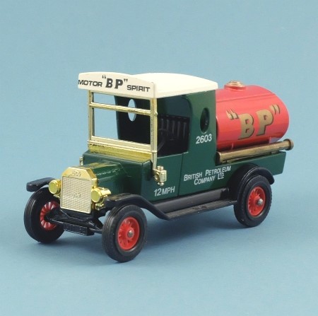 This was the first issue of the Model T tanker. In dark green with black chassis, red tank and white roof. Gold windscreen frame, headlights and grille. Gold hoses and filler caps. Black seats. 'BP' in gold on the tank, with black shading. Other lettering in white and black. Red 12 spoke wheels with black tyres.