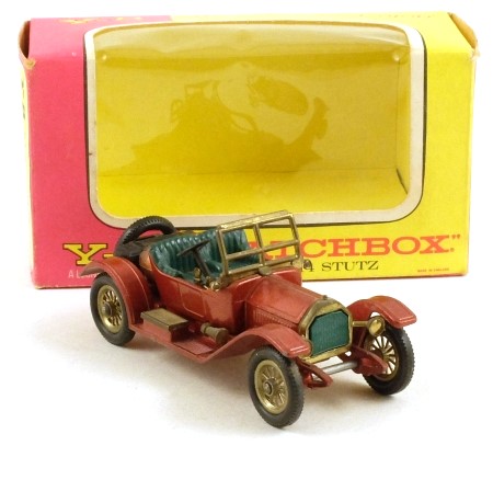 This model is finished in metallic brown-red with green seats and grille. Metal fittings - grille, lamps, windscreen and brake levers - are brass effect, and the fuel tank has a copper finish. At the rear there is a black plastic luggage trunk and spare tyre. Wheels are brass effect 12 spoked with black tyres.