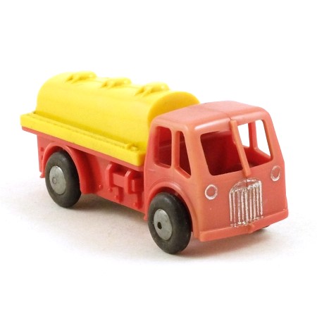 One of a series of small generic lorries originally launched as the OOO Series, although the scale is actually more like OO. Red lorry with yellow tank and silver grille and headlights. Push and go friction motor driving the rear axle. Smooth unpainted metal wheels with black tyres.