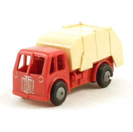 One of a series of small generic lorries originally launched as the OOO Series, although the scale is actually more like OO. Red lorry with beige-cream rear body. Silver grille and headlights. Push and go friction motor driving the rear axle. Smooth unpainted metal wheels with black tyres.