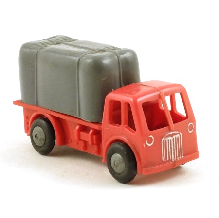 One of a series of small generic lorries originally launched as the OOO Series, although the scale is actually more like OO. Red lorry with grey sheeted load and silver grille and headlights. Push and go friction motor driving the rear axle. Smooth unpainted metal wheels with black tyres.