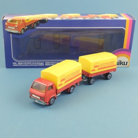 Red, with unpainted silver metal chassis, bumper, grille and headlights. The cab has an orange interior and clear window glazing. Both truck and trailer have yellow removable plastic tilts with 'Siku EXPRESS' on the sides in red, and drop-down tail boards. The trailer has an articulated front axle and tow bar. Black wheels with pale grey 'Siku' design.