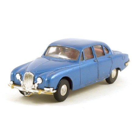 Metallic blue with silver plated grille, headlights and bumpers, and red rear lights. 'VYD 131' number plates. The interior is red with black steering wheel and driver and passenger figures. The base is light grey, and the wheels are spun aluminium with black tyres and suspension.