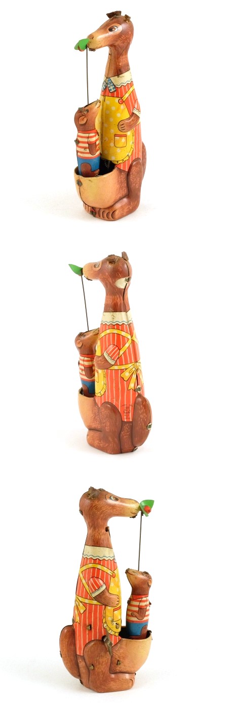 This tinplate kangaroo was made in Japan by TPS (Tokyo Plaything Shokai). She has has rubber ears and the apple she holds in her mouth has plastic leaves. In her pouch is a Joey which, when tapped on its head, jumps up and down, presumably trying to get the apple!